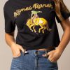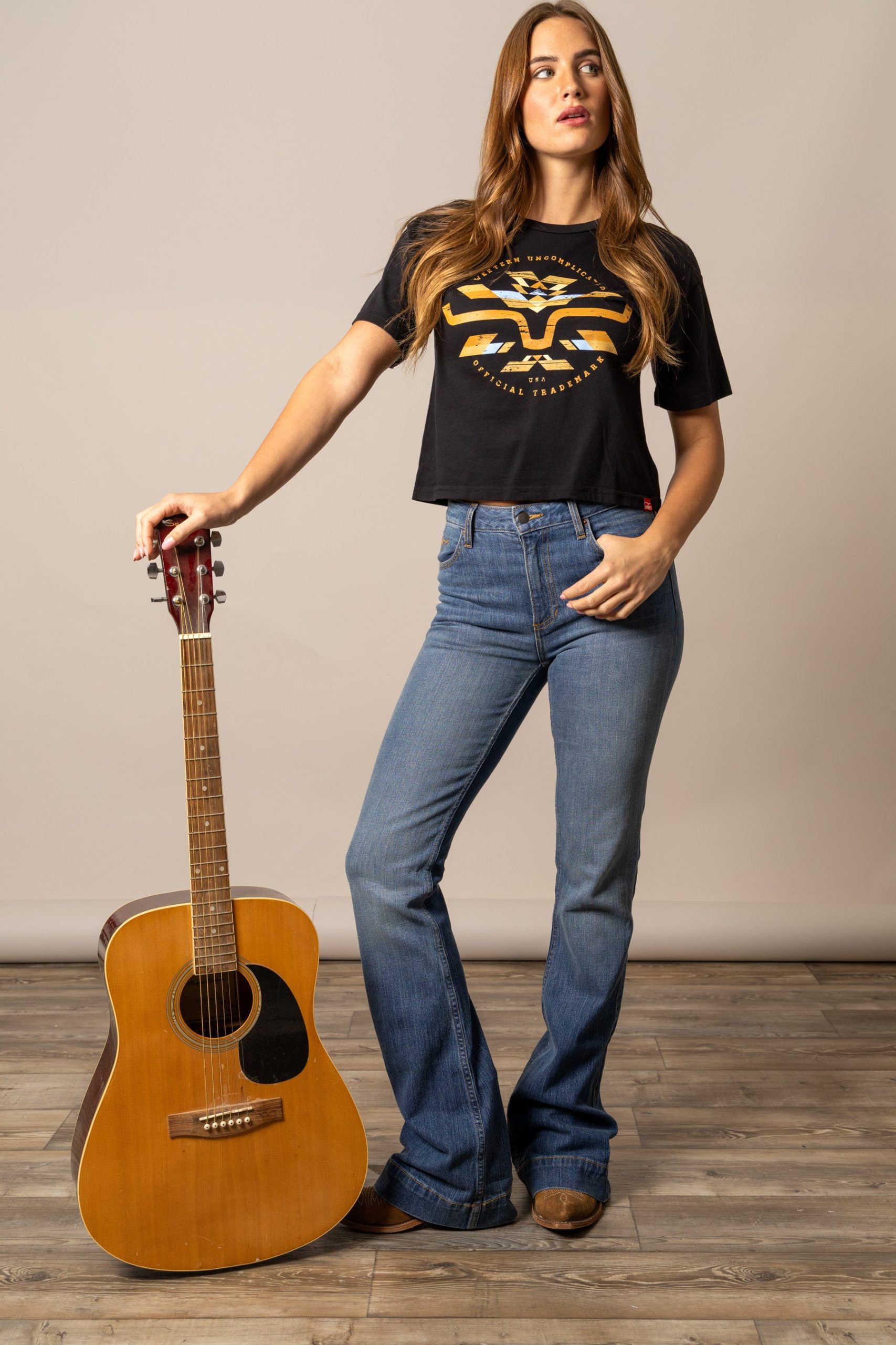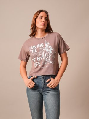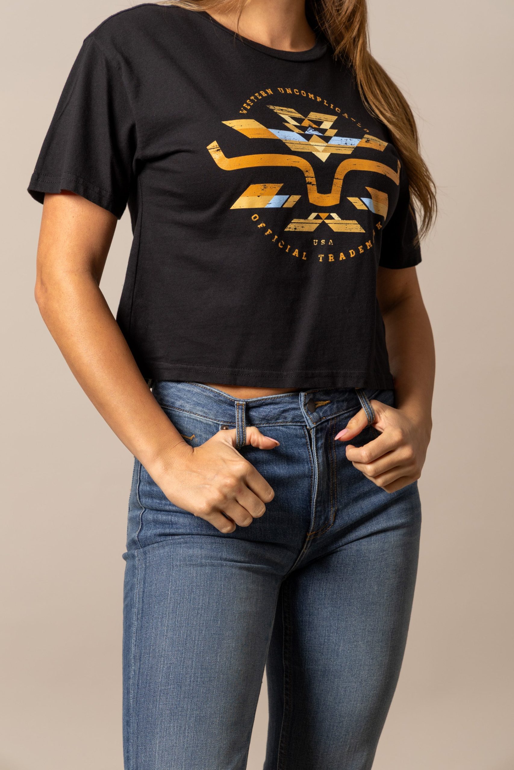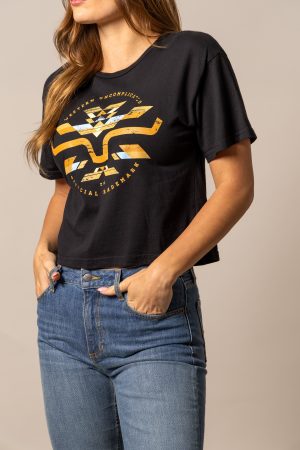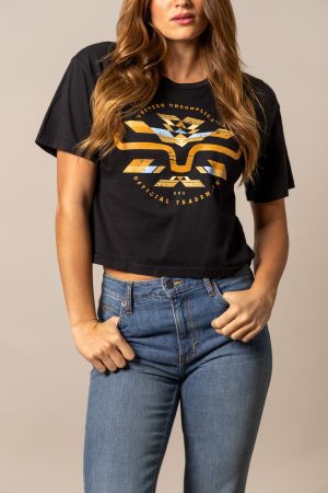 The Abiquiu Cropped Tee blends modern cowgirl style with bold western graphics. Featuring a striking geometric design across the chest. this tee is made from soft 100% cotton for all-day comfort. The boxy. cropped fit creates a contemporary silhouette that’s easy to pair with high-rise jeans or shorts. Available in versatile colors. the Abiquiu is perfect for casual days. concerts. and everyday ranch life.