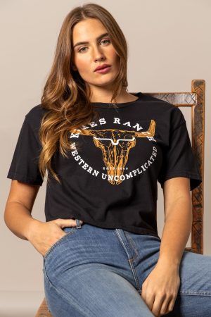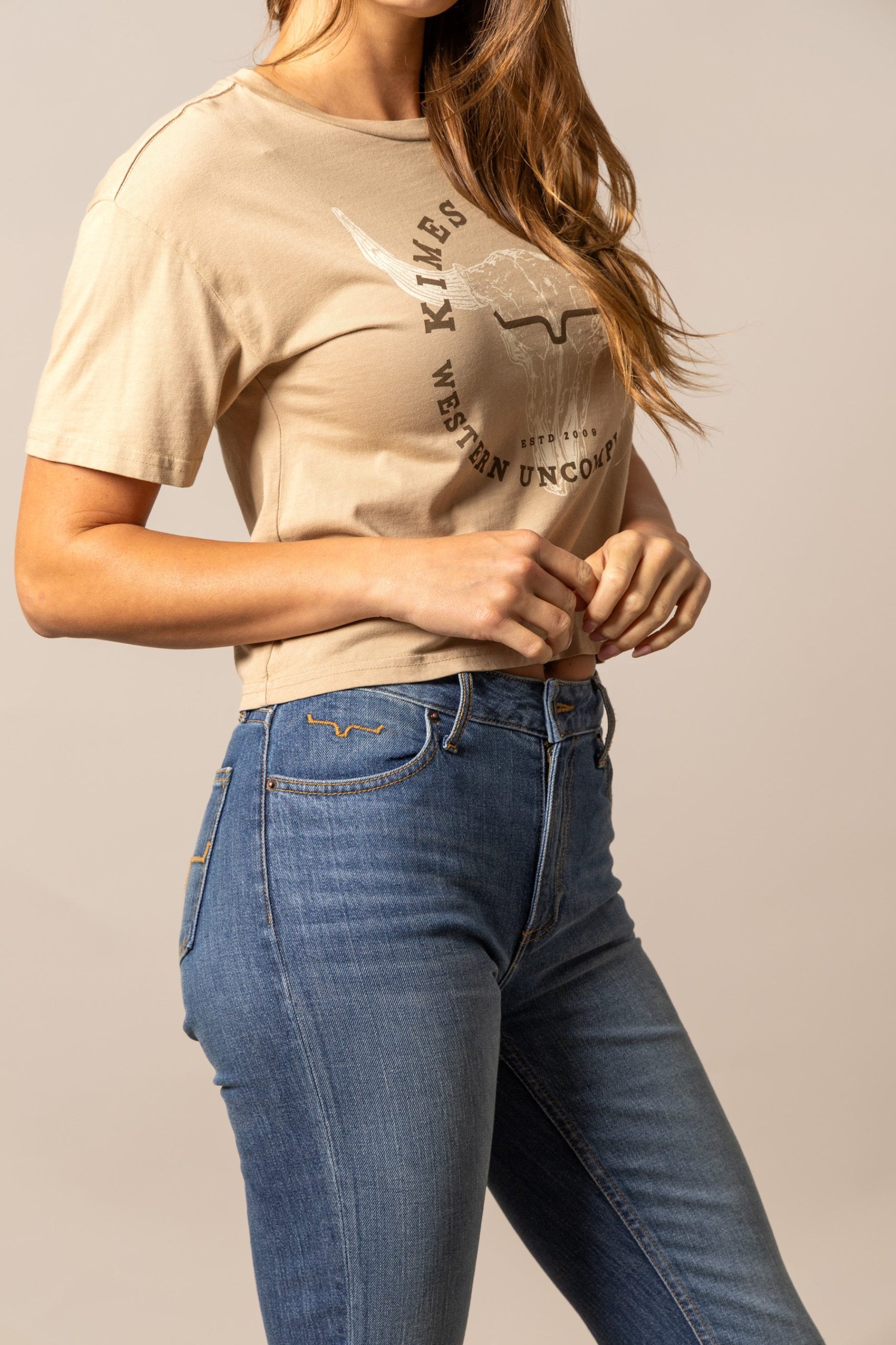 The Bison Skull Cropped Tee blends heritage and modern western style. Featuring a vintage-inspired bison skull graphic layered with the iconic Kimes Ranch logo. this tee delivers bold attitude and desert vibes in a clean. contemporary silhouette. Crafted from 100% ring spun cotton. it offers a soft feel. breathable comfort. and a flattering cropped fit perfect for concert nights. festivals. or laid-back days in the sun.