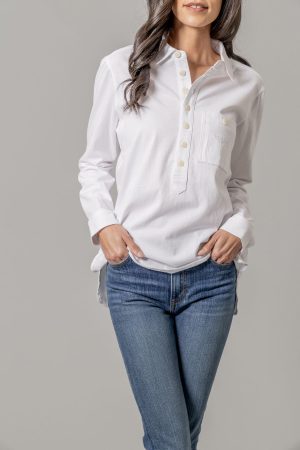 Details: Button-down front. faux pockets. and an adjustable back strap for a customizable fit.