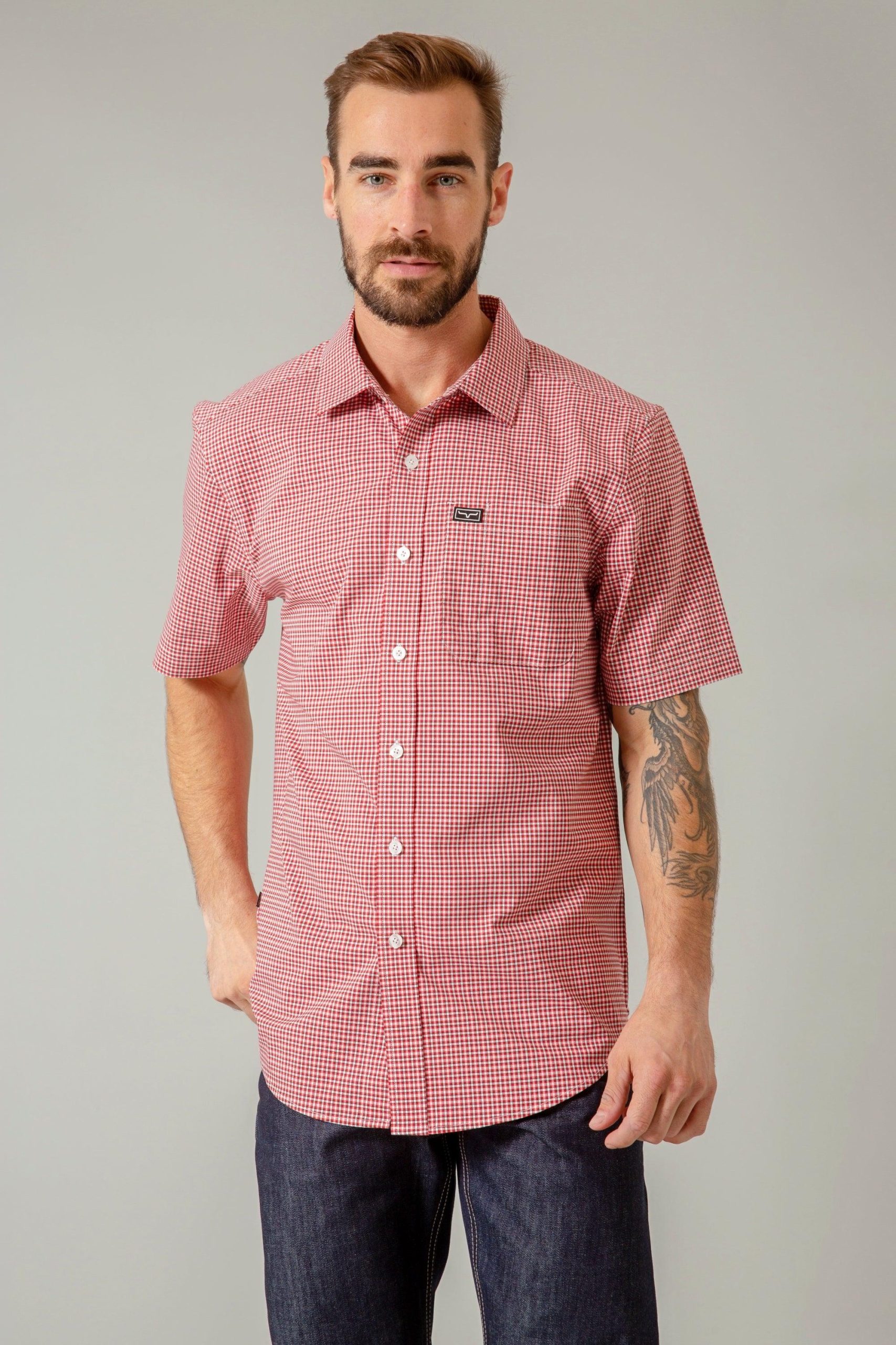 The Chute Mini Check is a short sleeve. button-down. casual dress shirt that features an all-over mini check pattern. moisture wicking Coolmax fabric. a single chest pocket. and tech patch with a small Longhorn logo. This piece easily transitions from western wear to the country club.