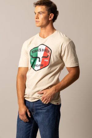 The Circular Serape Tee puts a bold Southwestern twist on a classic. Featuring the iconic Kimes Ranch logo reimagined with desert tones and geometric serape-inspired patterns. this shirt blends tradition with statement style. Soft and comfortable with an everyday fit. it’s made for those who carry their western roots with confidence.