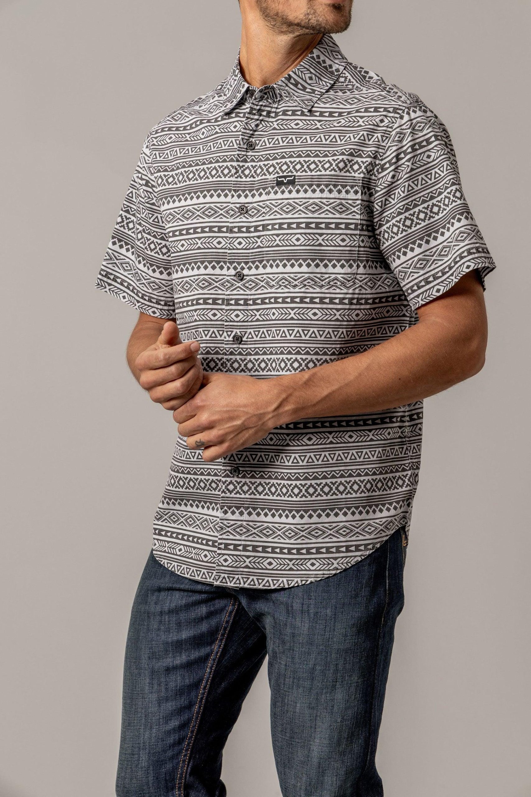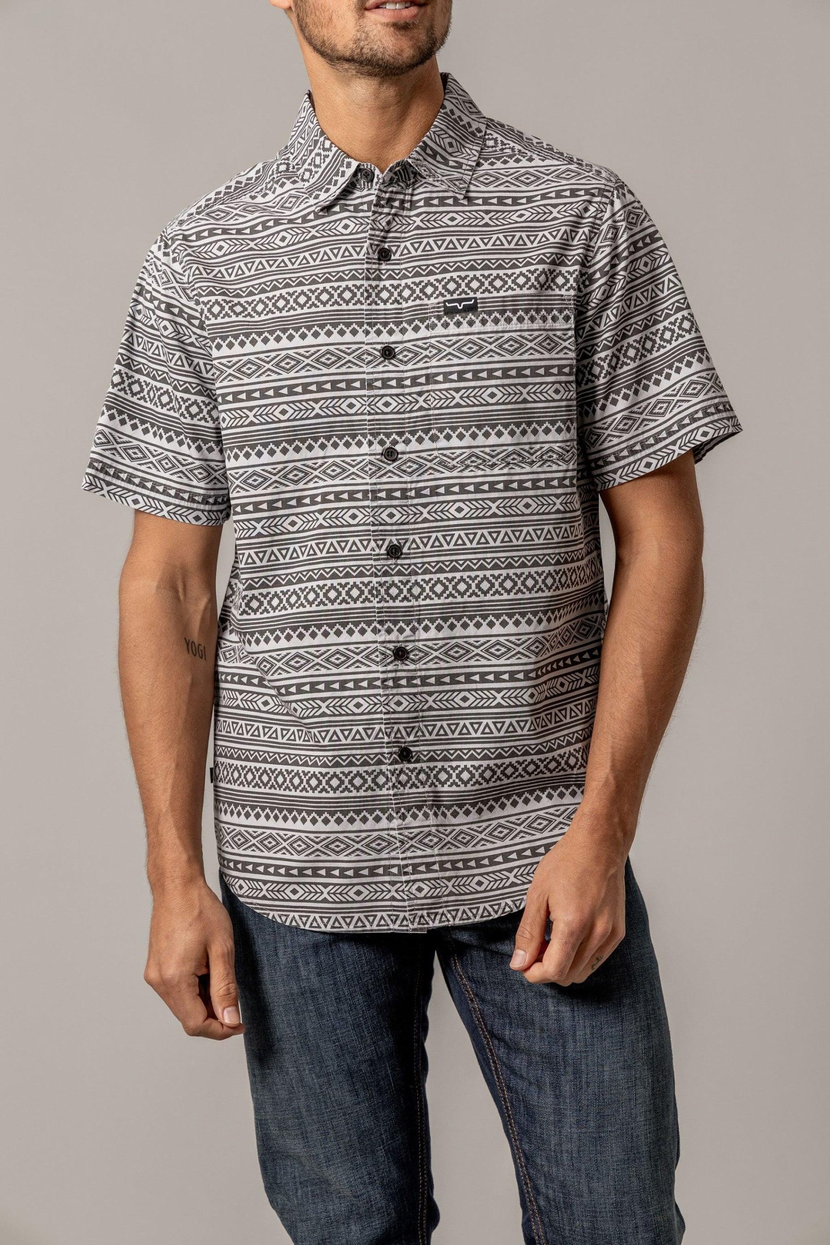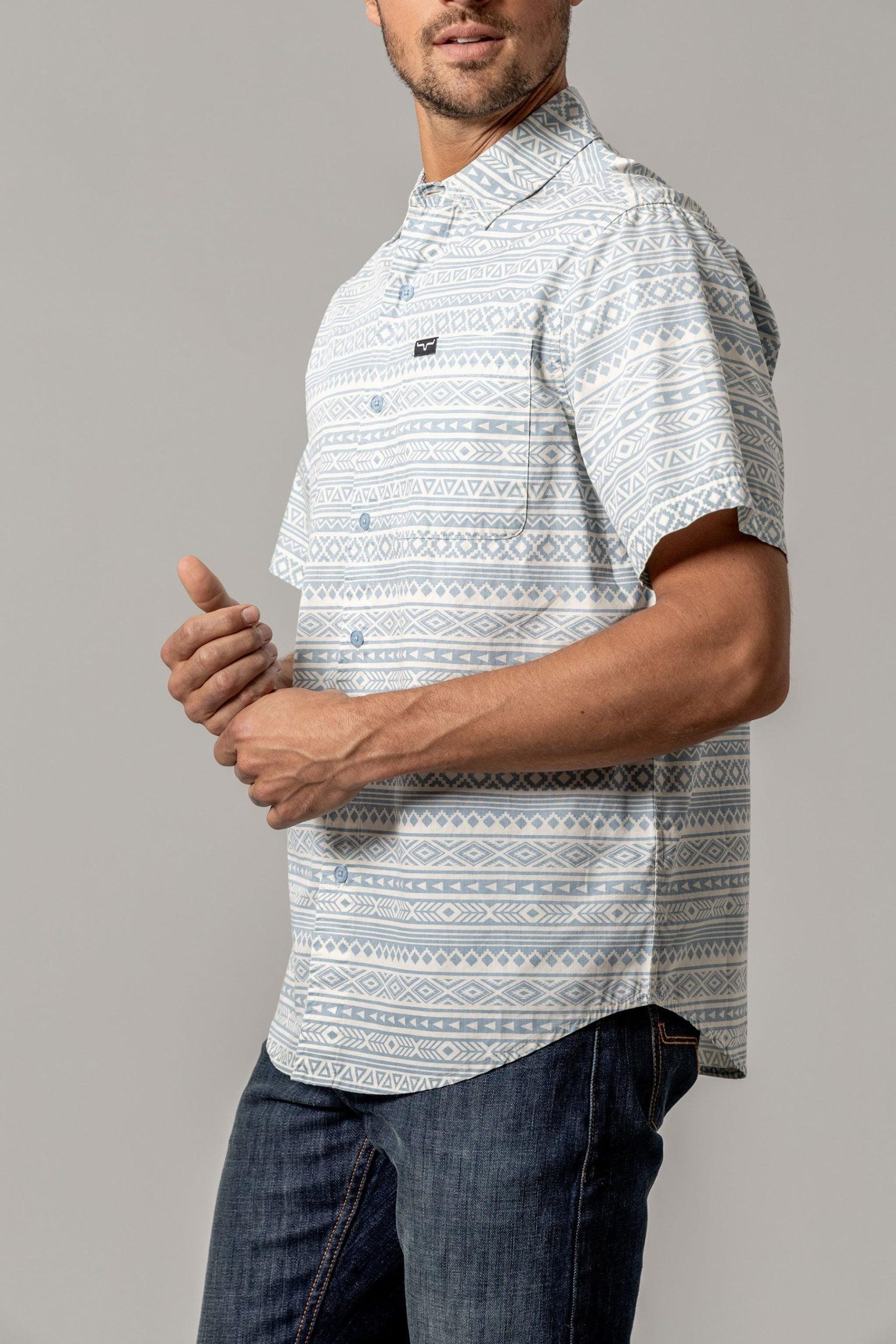 Made from crisp. breathable poplin cotton. the Colton offers all-day comfort and a polished look. A scoop hem looks polished untucked and collared neckline keeps you looking sharp. Featuring an adventurous southwestern print all over. this button-up shirt is sure to be a go-to favorite.