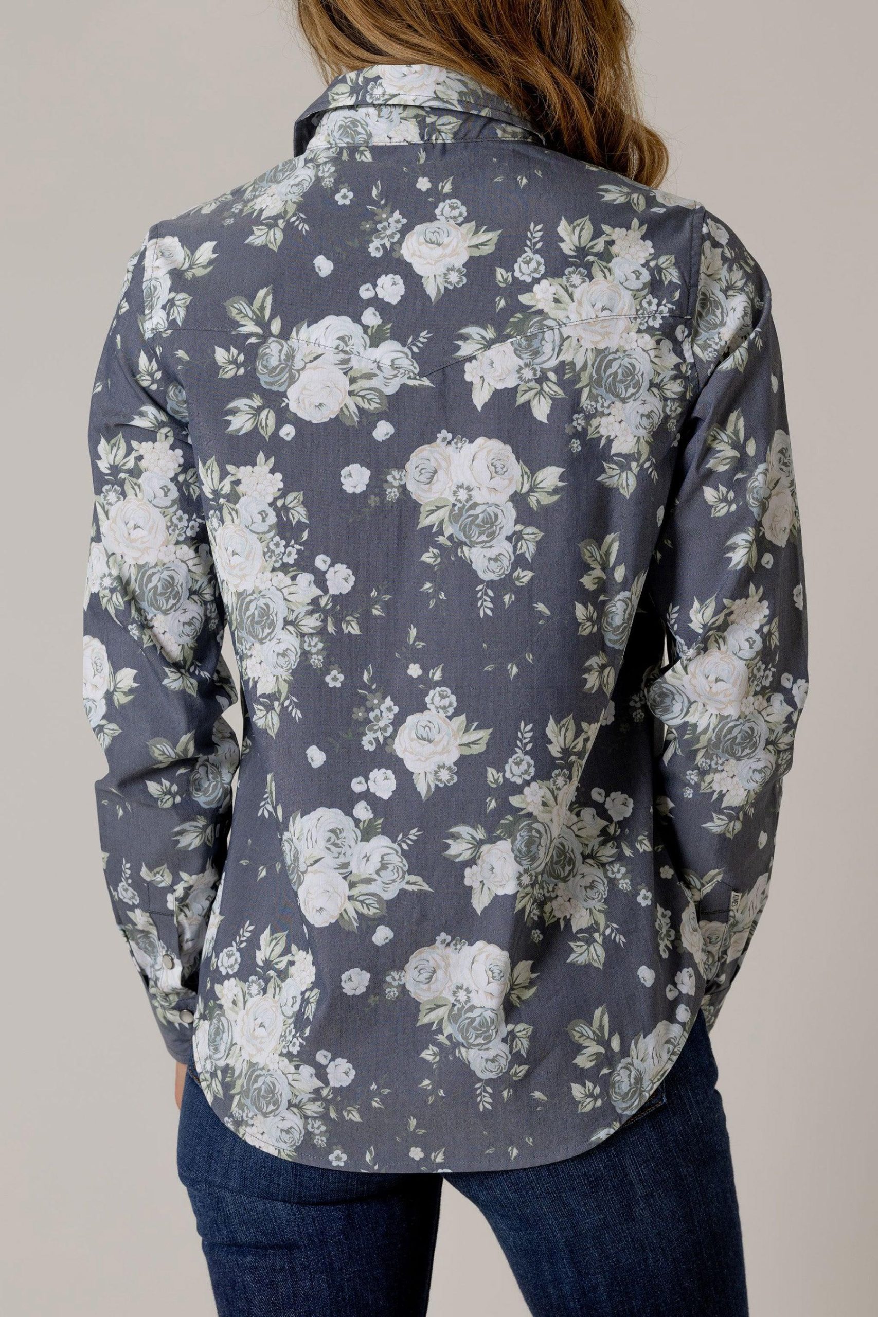 The Ginny is one of the most charming shirts on the market. This eye-catching piece features a vibrant rose pattern. paired with classic pearl snap closures and functional pockets. making it a statement piece perfect for any occasion. This western-fitted long sleeve button up is sure to stand out.