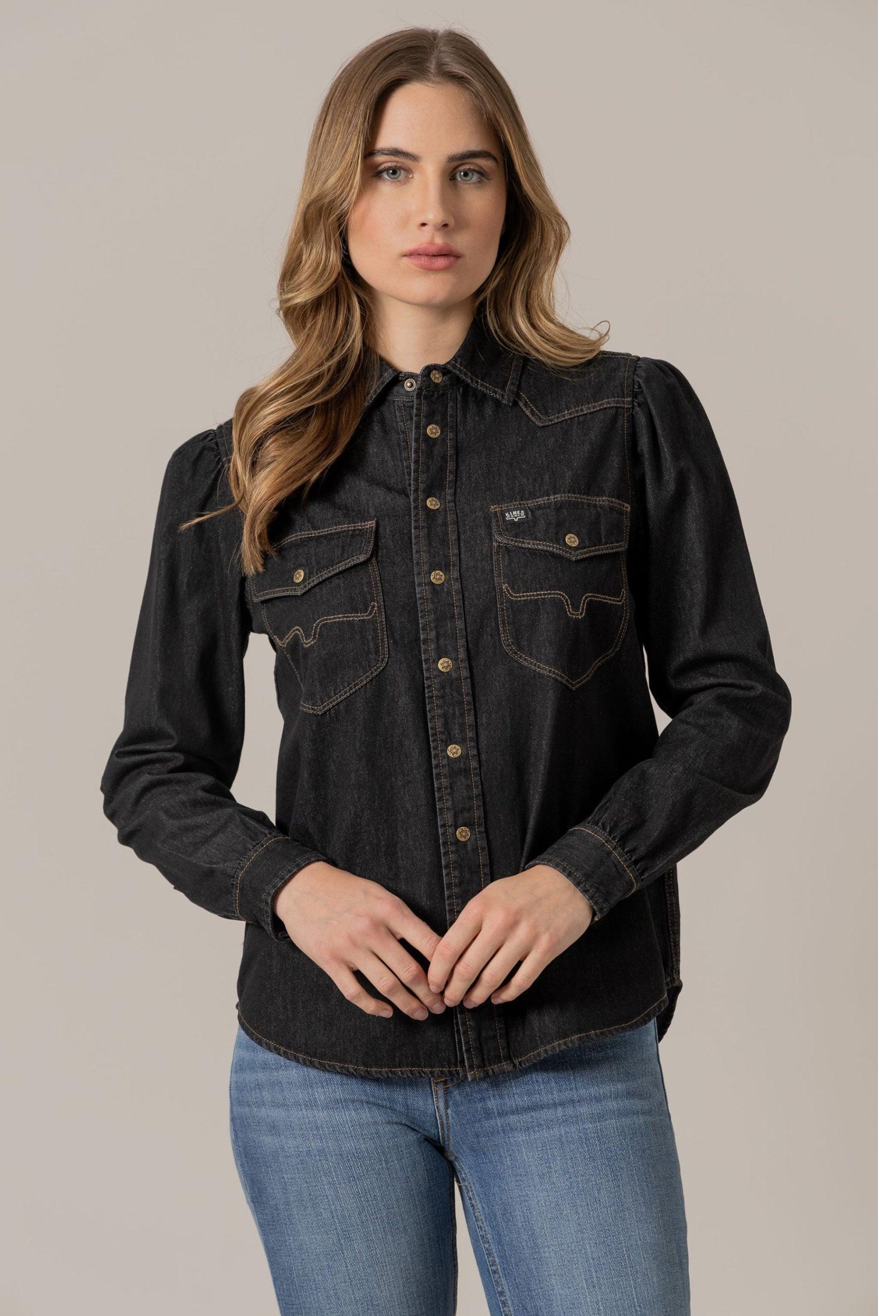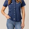 The Jane provides a stunning blend of classic Western inspiration and contemporary comfort. This unique piece features chunky. three-row contrast stitching. adding a touch of rugged authenticity to the soft. sustainable Tencel fabric. Features of this button-up include a gathered cap sleeve. a western style yoke. brass snap buttons with an etched star design. and double chest pockets boasting the iconic longhorn logo.