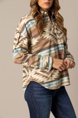 The Judith has a soft terry material with a southwestern pattern that is sure to make you feel just as good as you look with it on. A long body with inset pockets provides coverage and comfort. and the button opening provides a stylish front.
