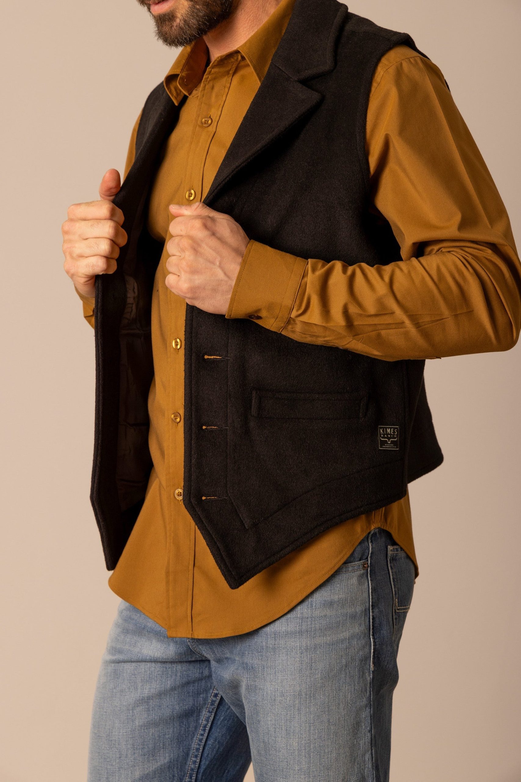 The Kraken Vest is where rugged western tradition meets refined craftsmanship. Made from a warm and durable wool blend. this piece provides comfort and structure without sacrificing style. Classic details like a notched collar. pointed and tapered hem. and four functional welt pockets bring authentic vintage character. The button-front closure completes the timeless look. Perfect for layering over a crisp shirt or under a jacket. the Kraken offers the perfect balance of Wild West spirit and modern sophistication.