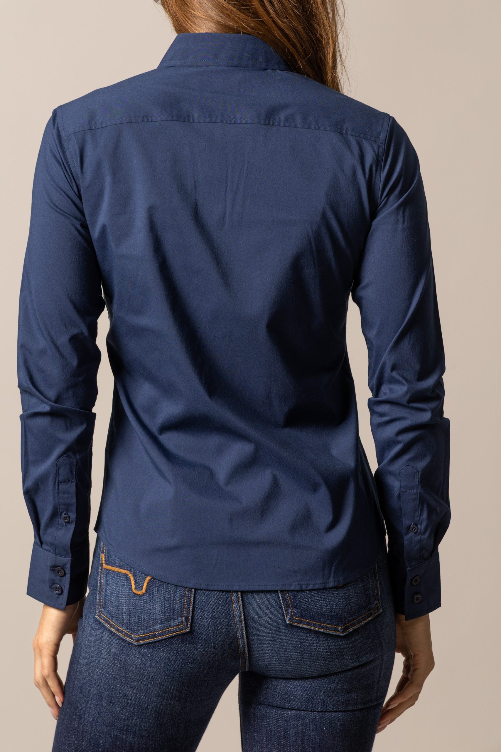 Details: Long Sleeve Solid Shirt. Classic Button Front and Sleeves. Single. Pointed Pocket with Embroidered Logo on Top Hem