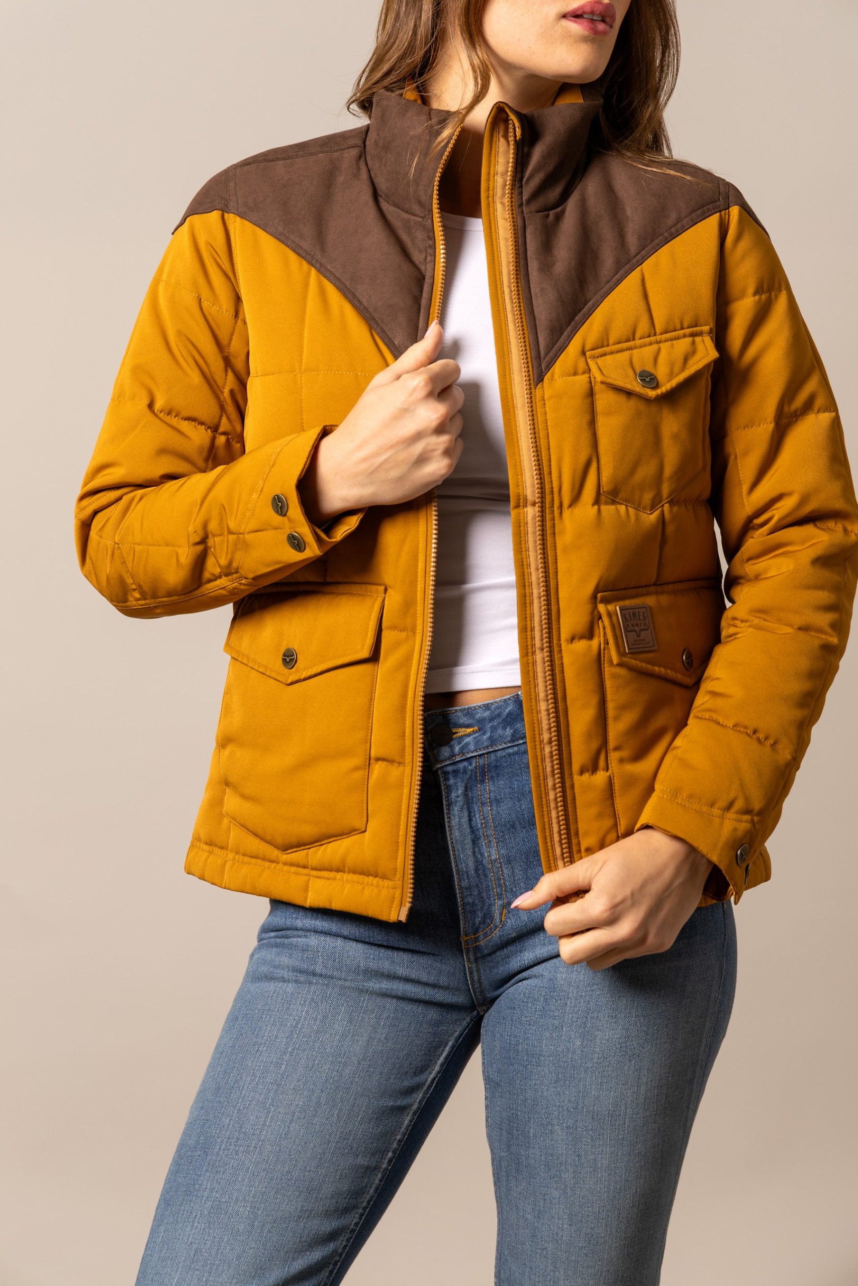 The Lenora Jacket is a timeless western-inspired coat designed to keep you warm in every season. This classic puffer style features a dark brown suede yoke and collar that add contrast and character. while snap buttons and four functional pockets combine practicality with refined design. Horn embroidery adds signature Kimes Ranch detail. and additional hand pockets with snap closures ensure all-day utility. Finished with a slanted chest pocket and a workday patch. the Lenora brings together durability. warmth. and style in one effortless layer.