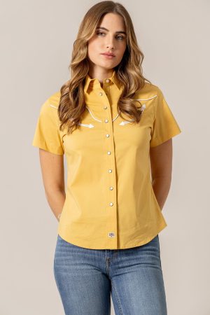 Talk about style! The Logo Horn Snap is the shirt that blends timeless western details with modern comfort. This unique piece features a hidden surprise. a longhorn logo incorporated into the yoke. and vintage-inspired arrows at the front. This fitted women’s short sleeve button-up will never get old.