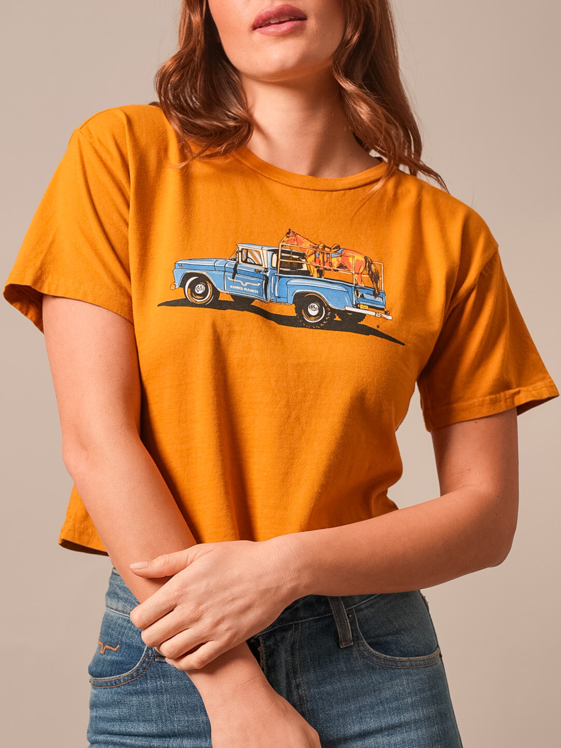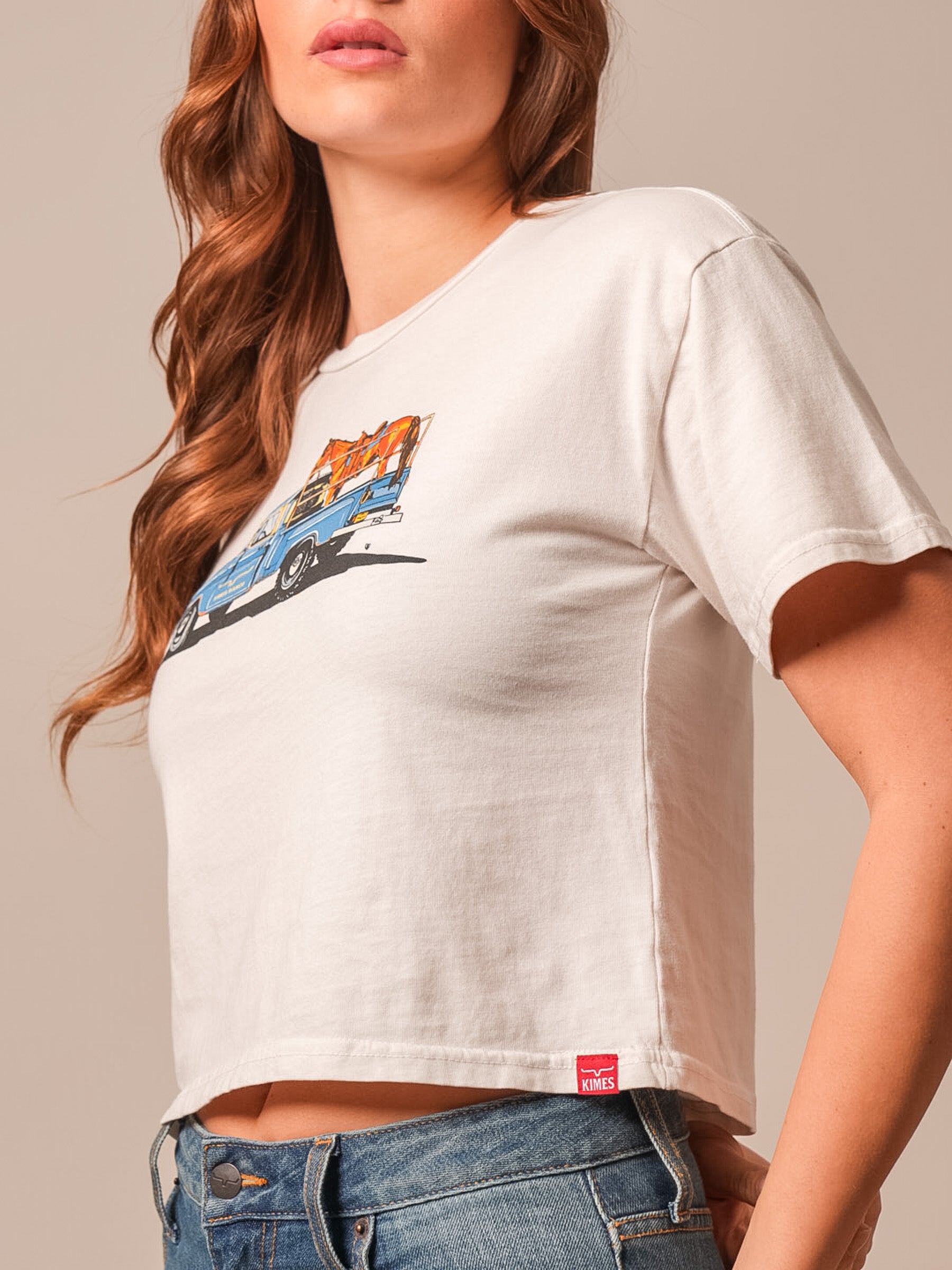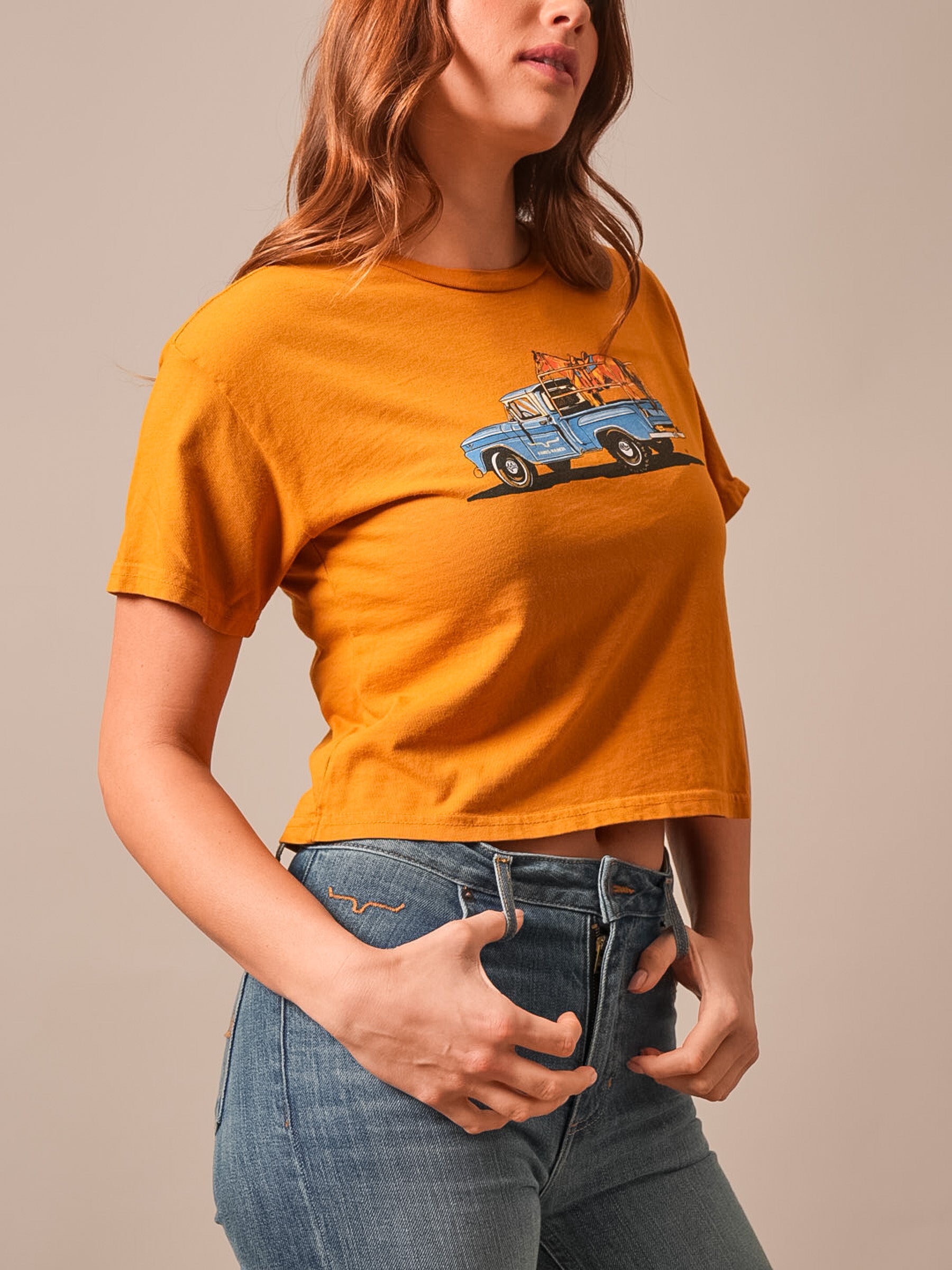The Lucky B Pick Up Tee brings a little road-trip spirit and western charm to your everyday style. Designed in collaboration with Lucky B Designs. this cropped tee features a hand-painted pickup truck graphic that feels nostalgic and full of character. The soft. pigment-washed fabric and flattering fit make it easy to pair with high-rise denim for a laid-back cowgirl look that works from the feed store to town and everywhere in between. Classic western attitude with a playful edge.