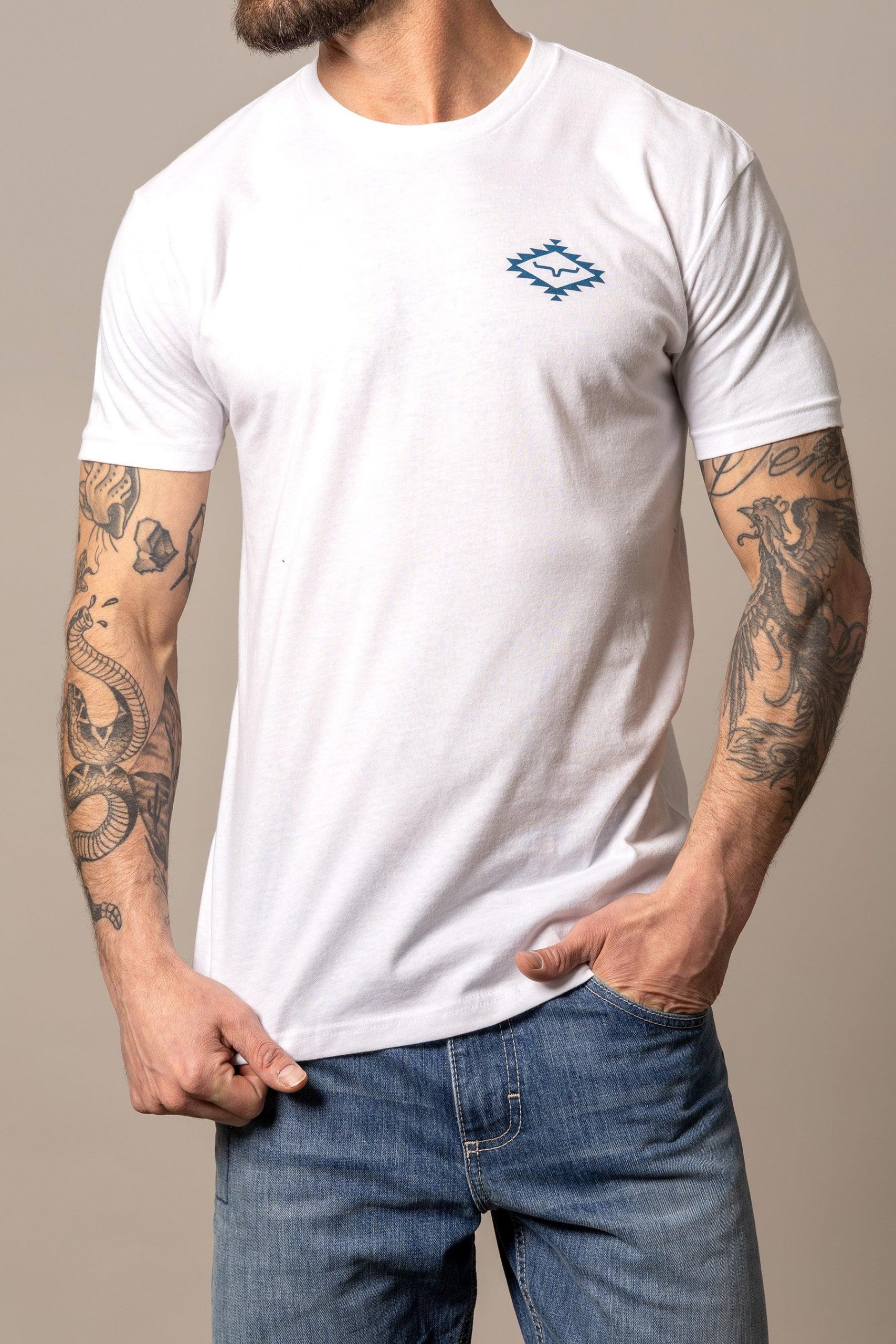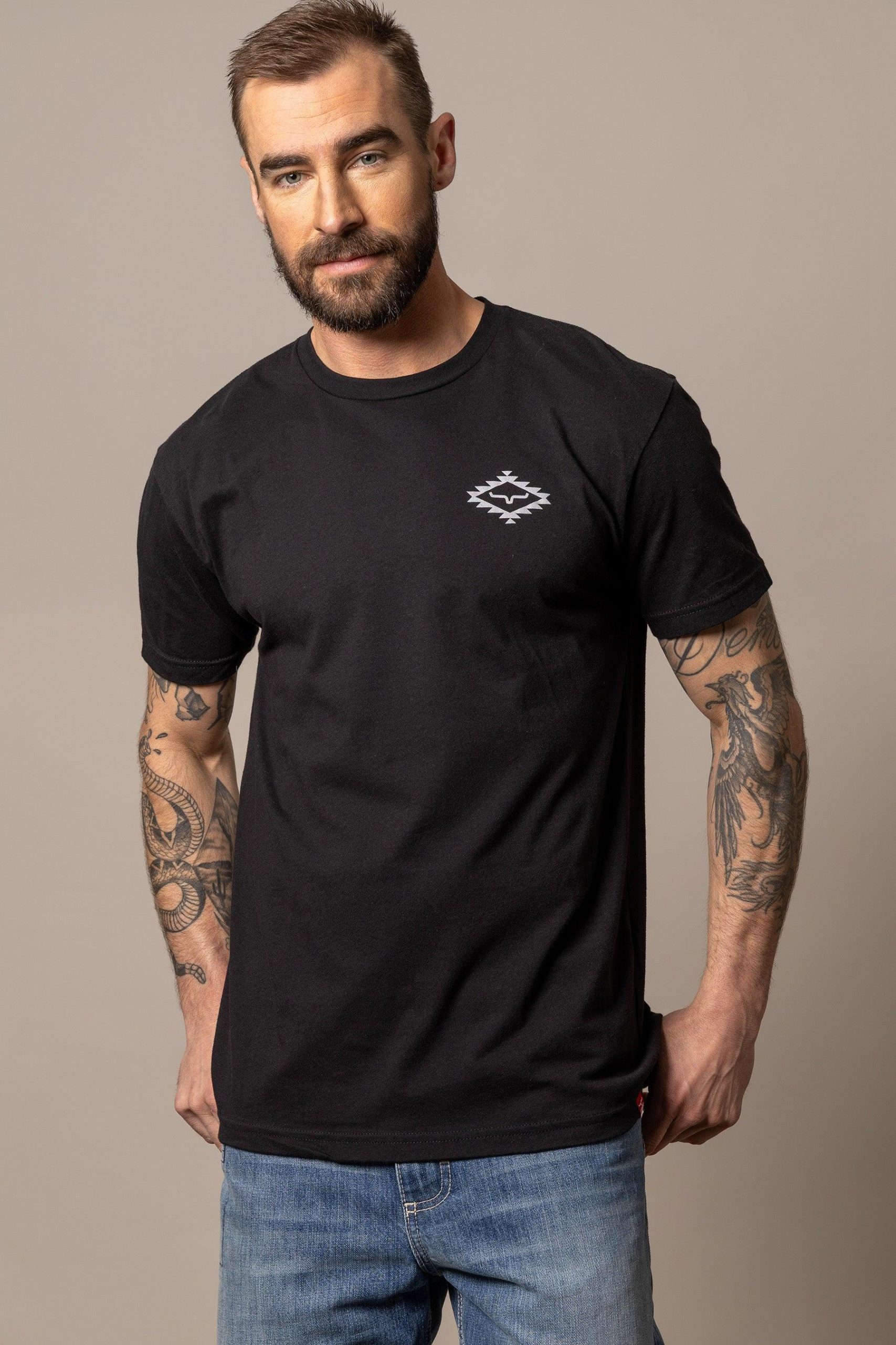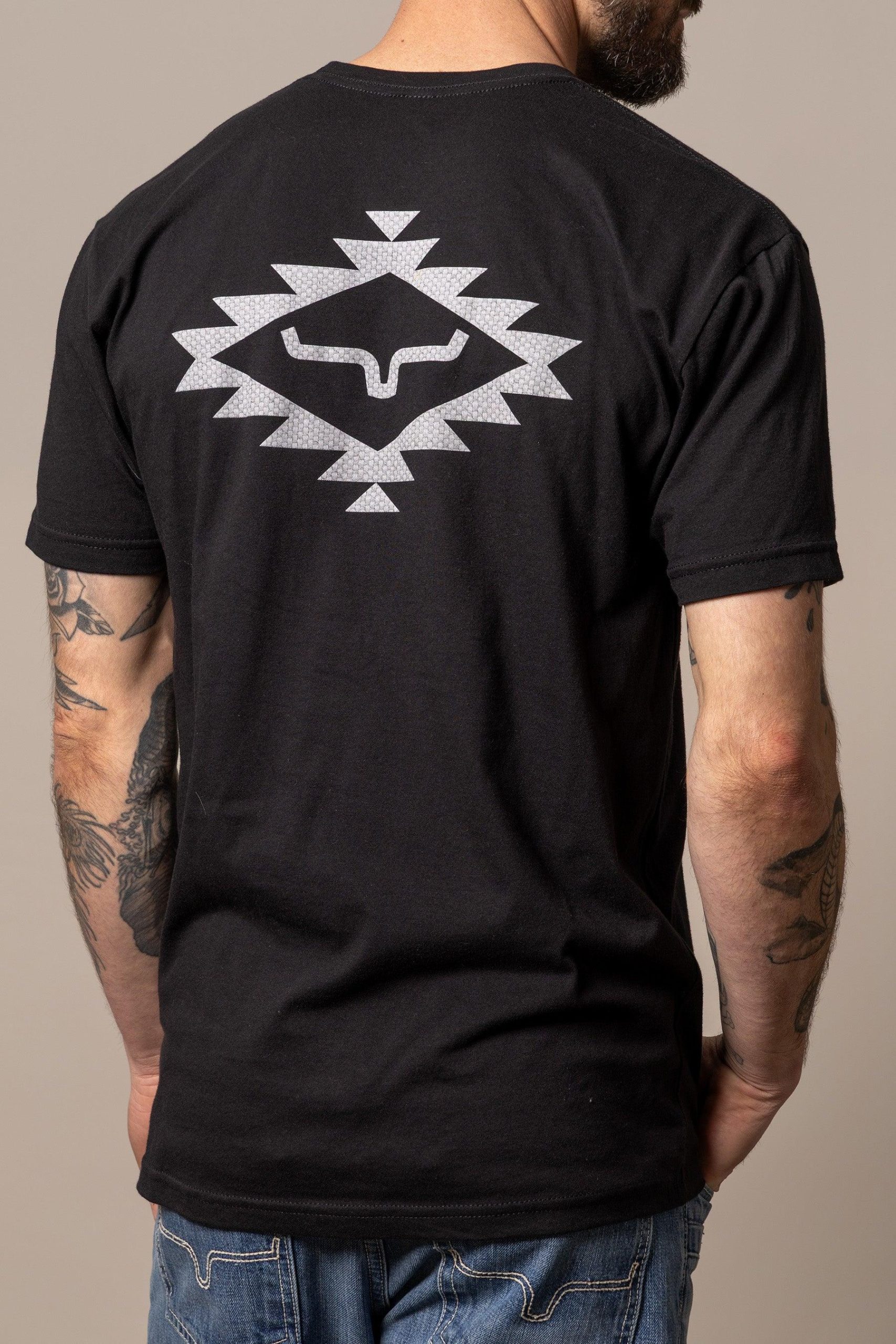 The back of this shirt features a large Kimes Ranch logo surrounded by a classic southwestern design. This logo is repeated on the front left chest.