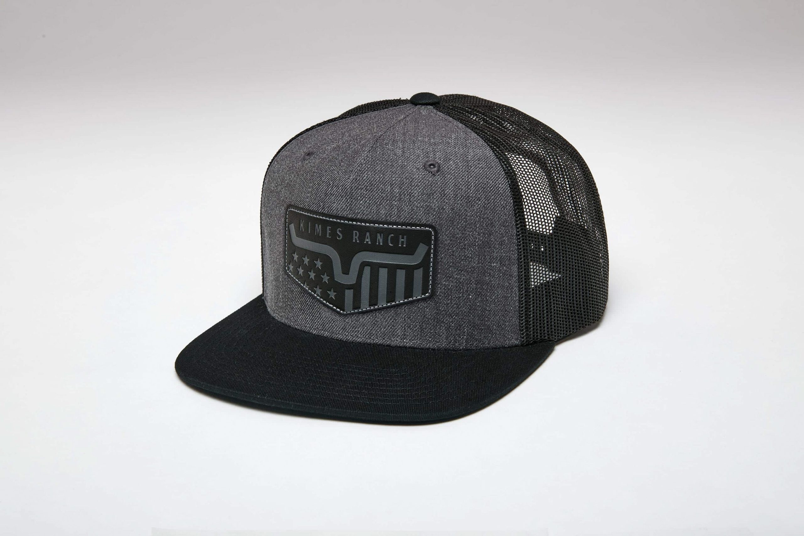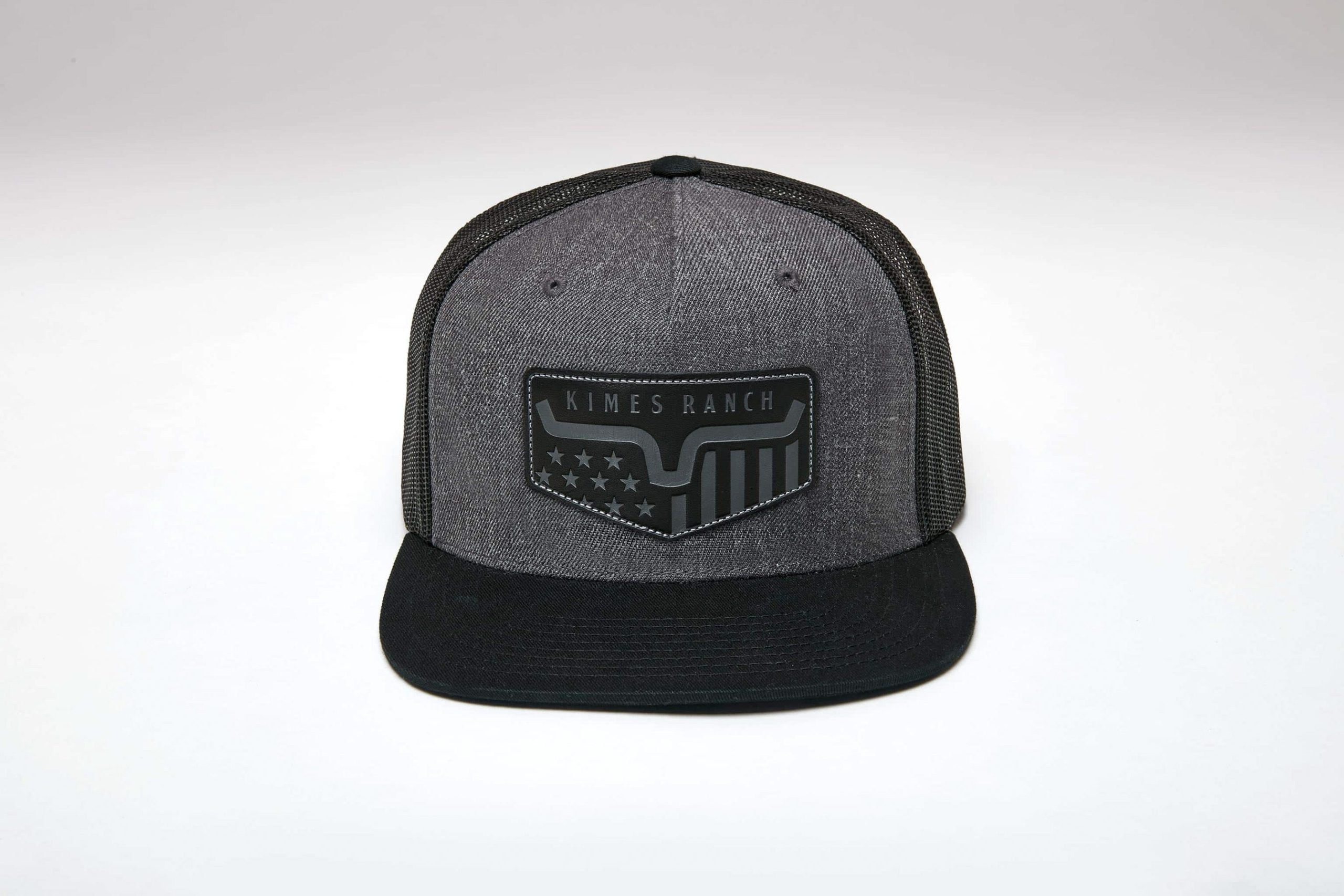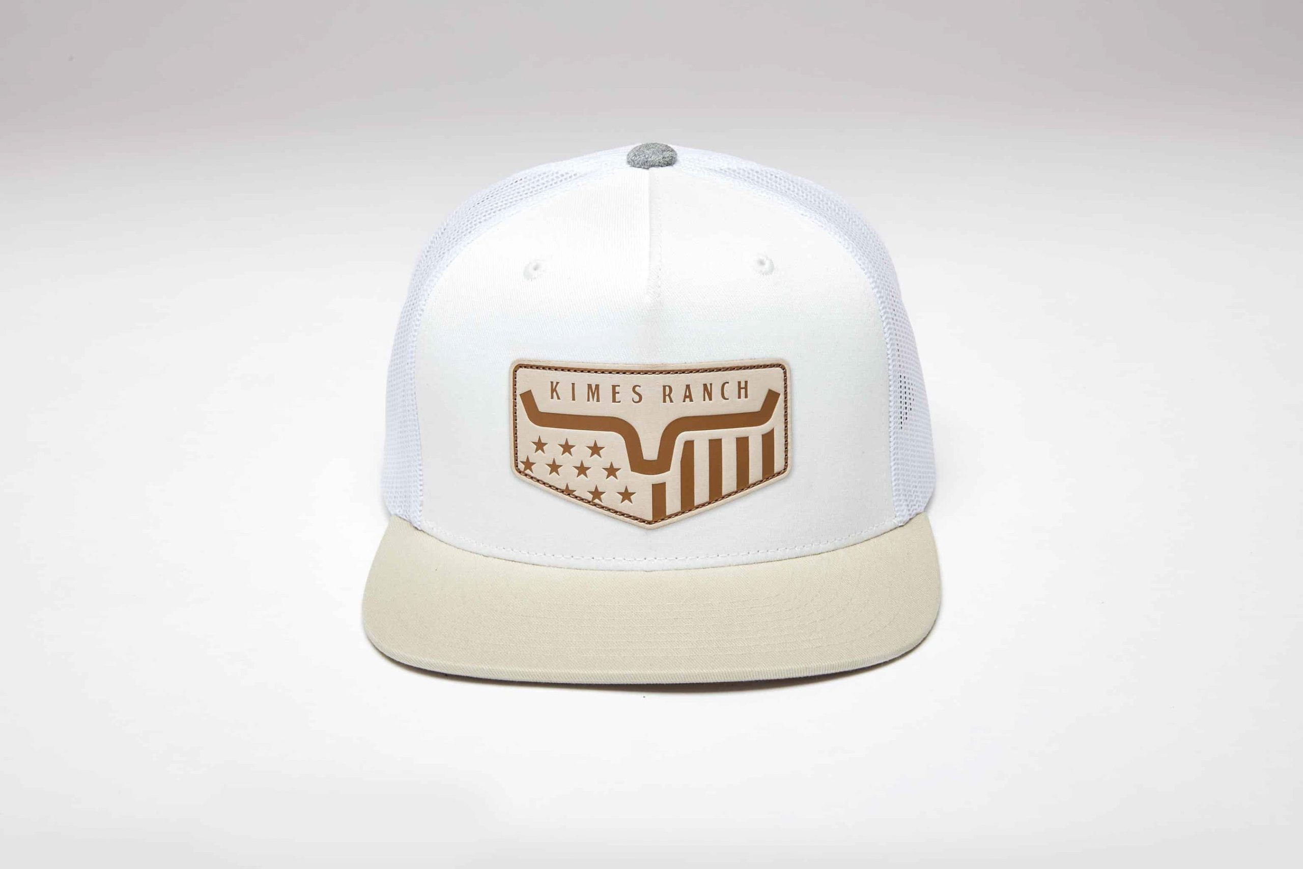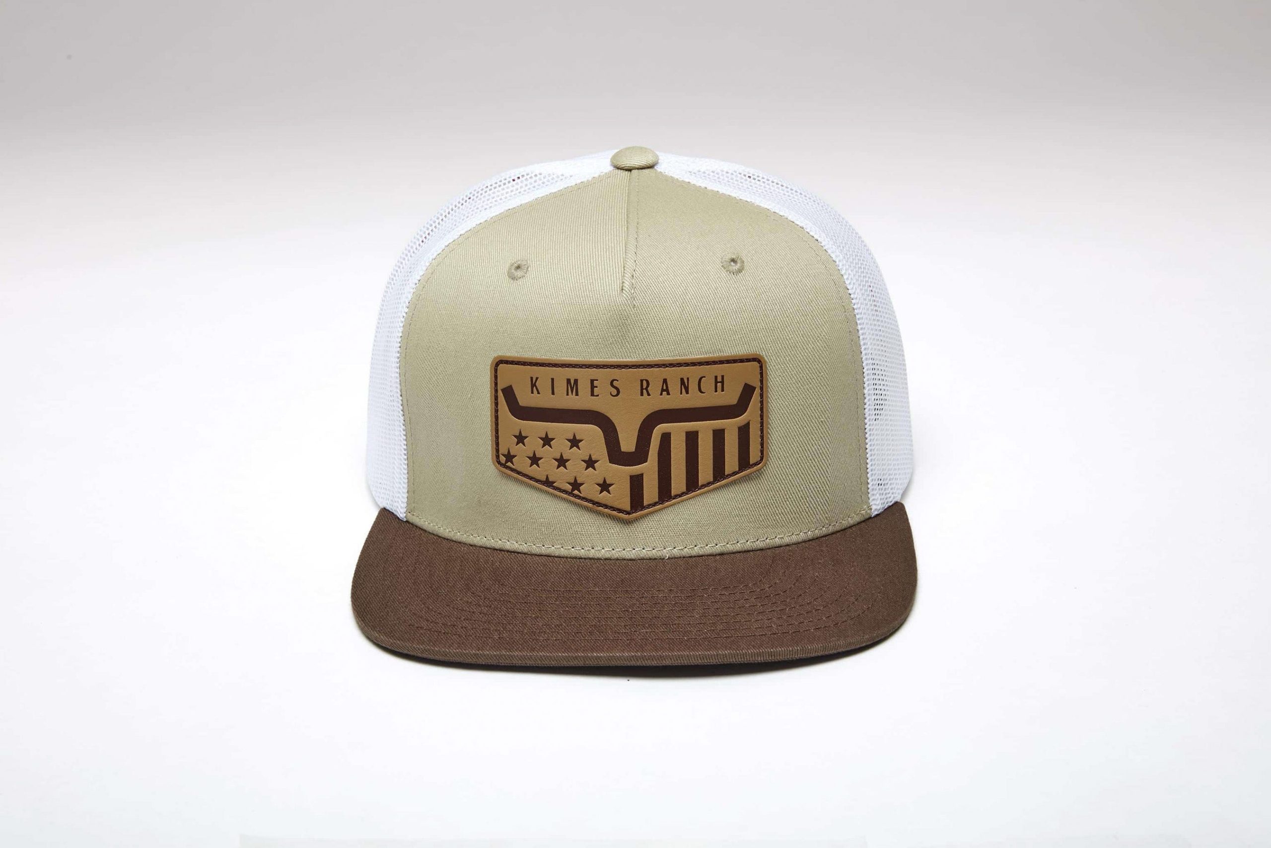 The Spangled Hat embodies Western pride and modern craftsmanship. This 6-panel ranch hat features a high-profile. structured fit with a flat bill and premium details throughout. A genuine leather patch embossed with the Kimes Ranch logo and an American flag motif highlights its rugged character. while the faux suede bill adds texture and a refined finish.