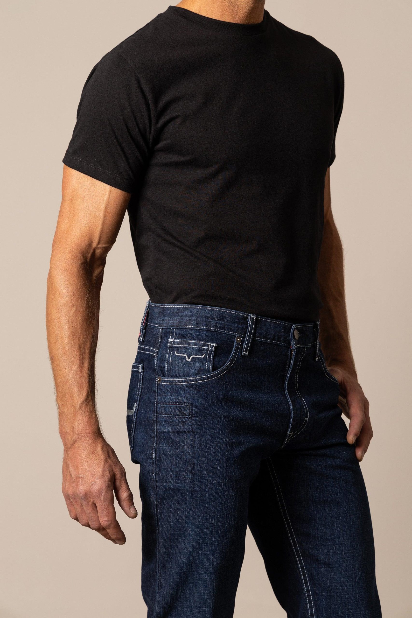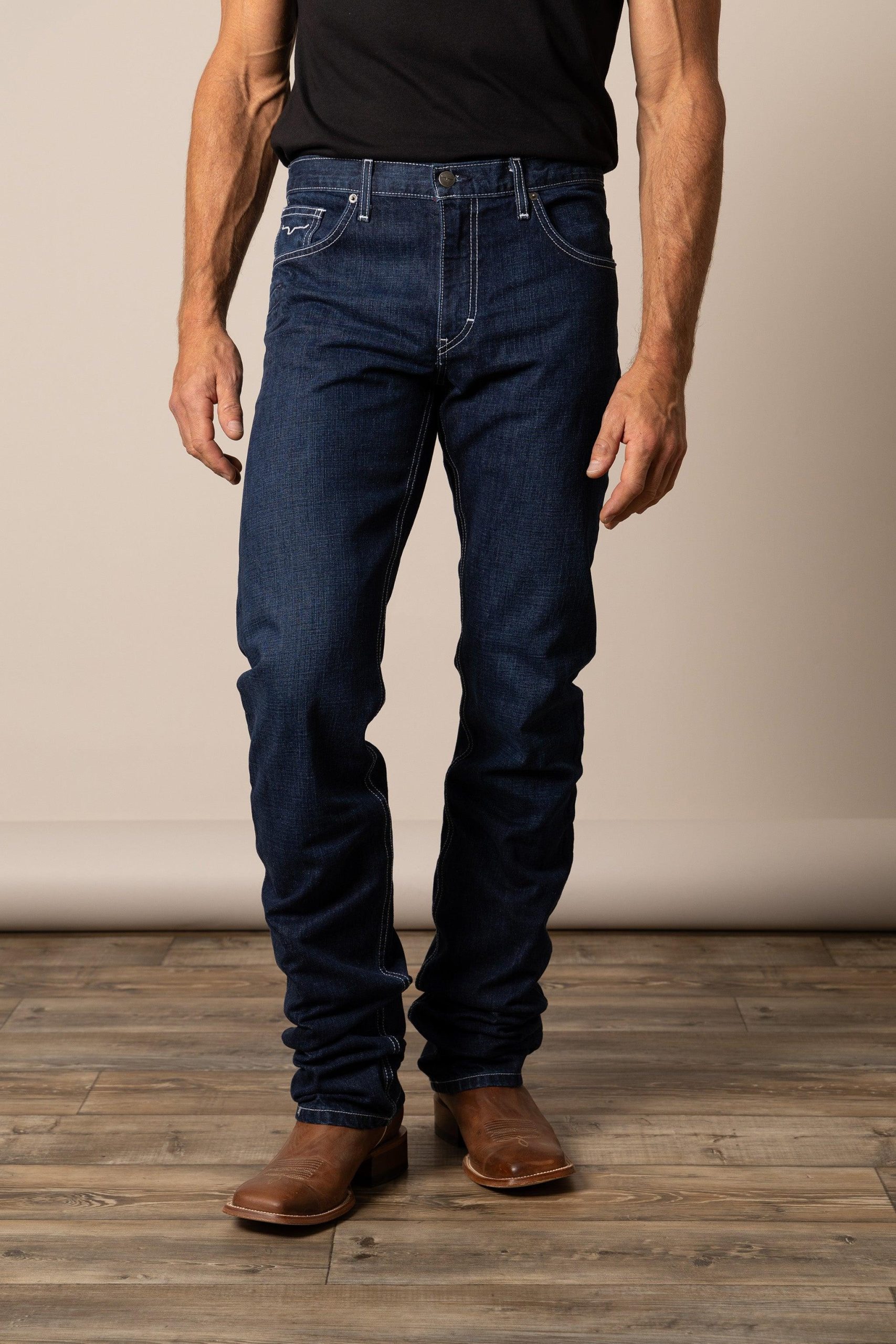 The Thomas features our bestselling cotton denim in a lower rise. straight fit jean. This 13 oz dark denim jean features our iconic Longhorn logo in embroidered detail on the back pockets.