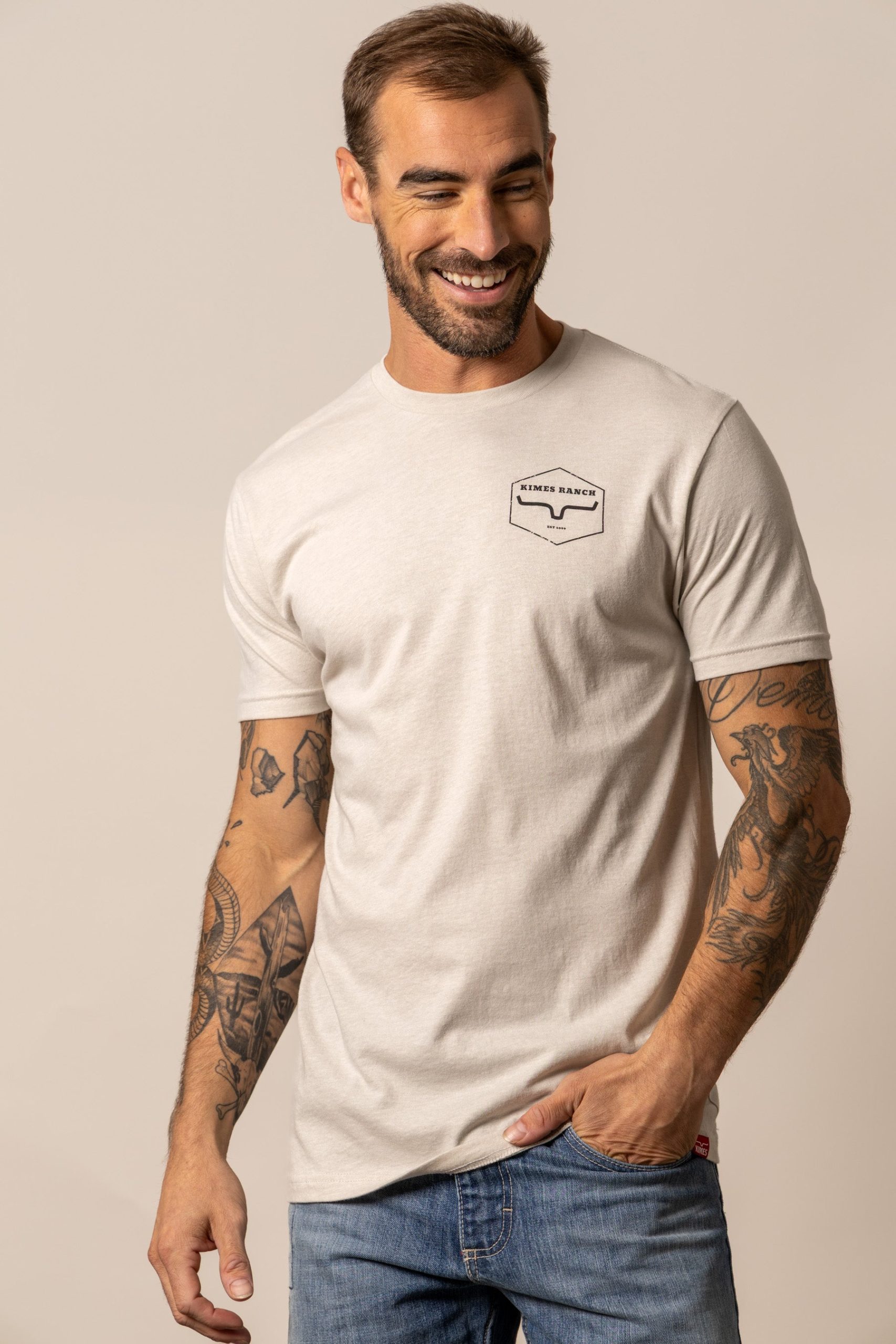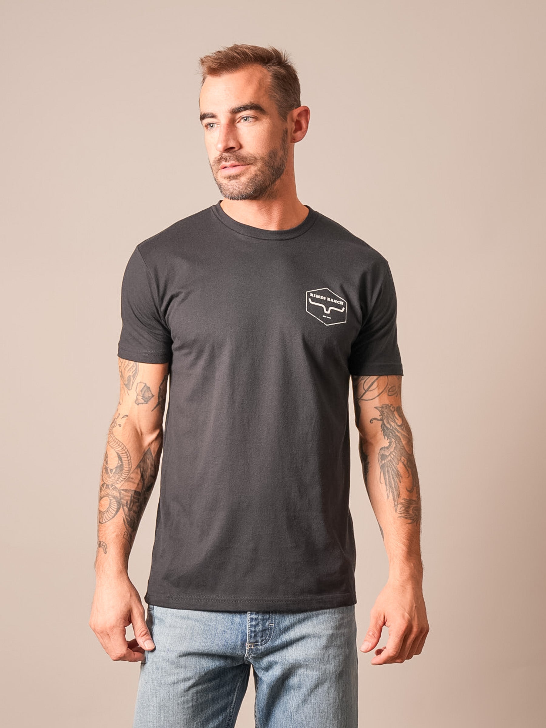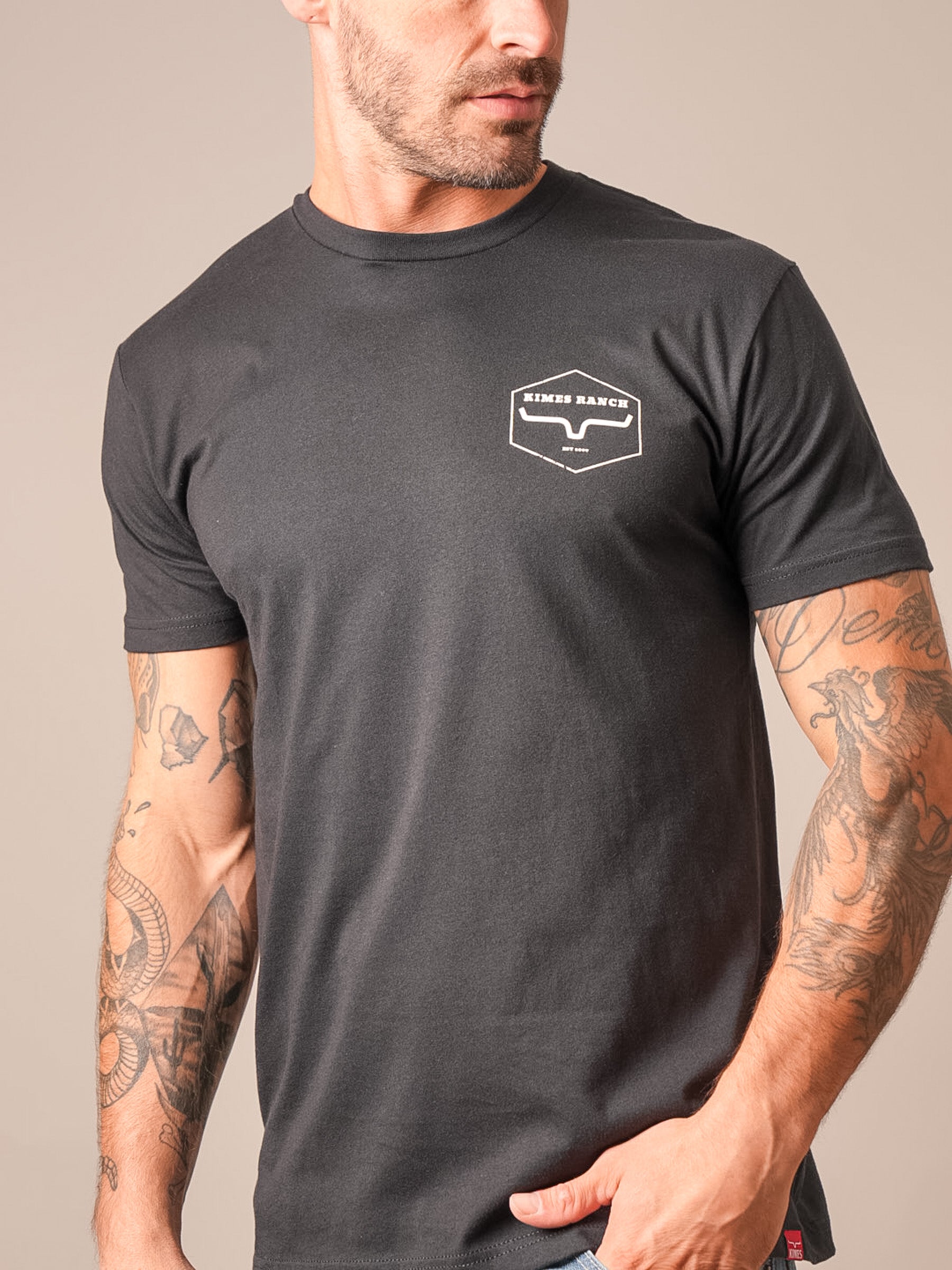 The Wooden Hex Tee blends rustic charm with timeless western style. Featuring a small Kimes Ranch hexagon logo on the front chest and a large vintage-inspired emblem across the back. this shirt is perfect for those who appreciate authentic country heritage. Crafted from a 60% cotton and 40% polyester blend. it offers softness. durability. and a comfortable men’s regular fit. Finished with a soft-hand print for a premium feel. it’s ready for work. play. and everything in between.